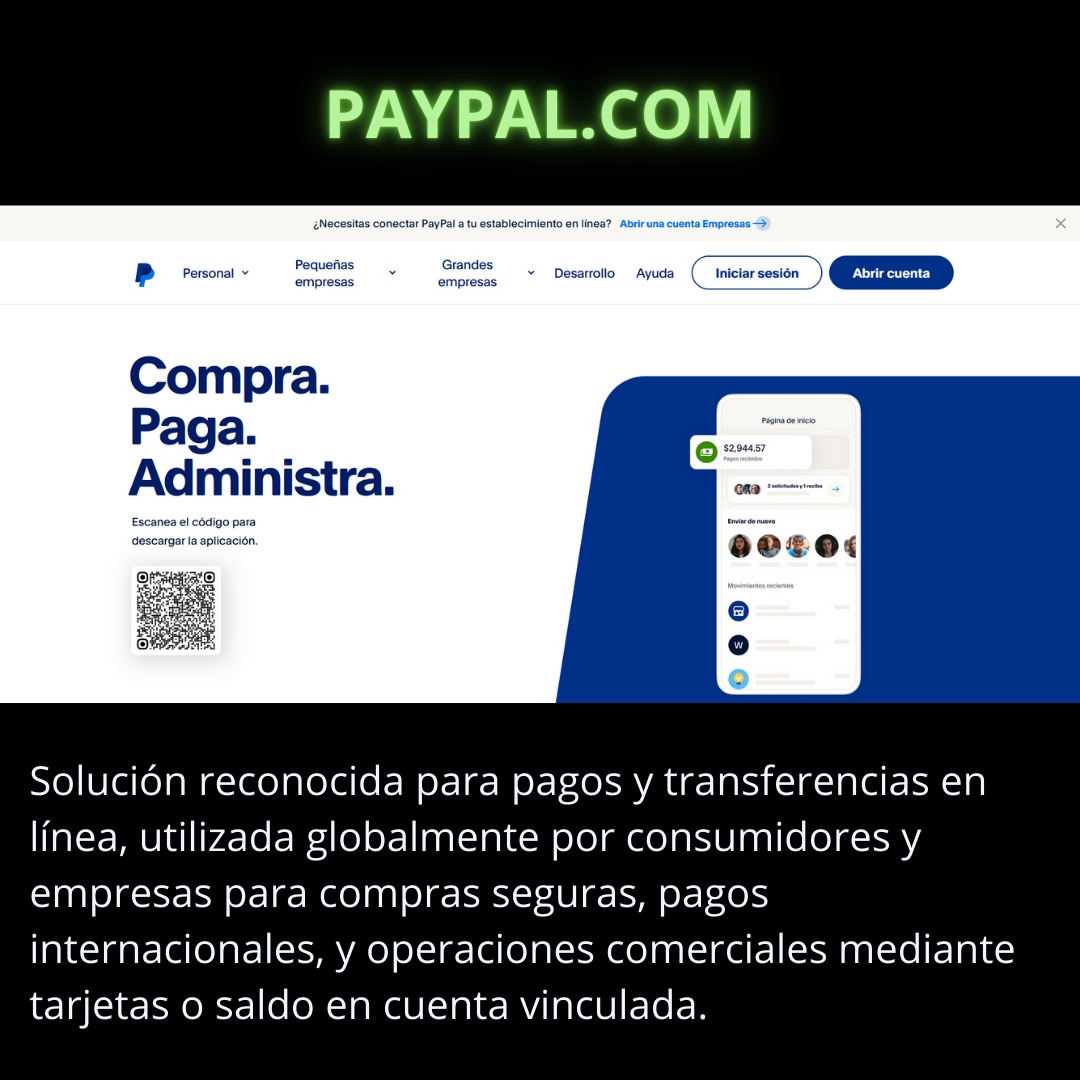 PayPal es una plataforma de pagos reconocida mundialmente que facilita transacciones entre empresas y consumidores en línea. Funciona en la mayoría de los países, ofreciendo pagos seguros y transferencias rápidas. Es ideal para negocios pequeños y medianos, así como freelancers.