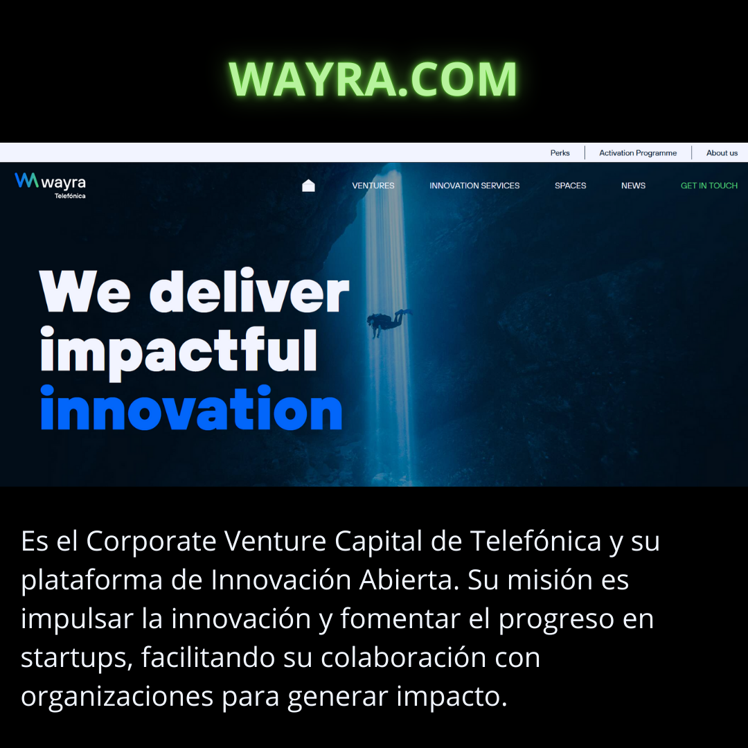 Wayra es la aceleradora de startups de Telefónica, con sedes en varios países de América Latina y Europa. Se enfocan en empresas que puedan colaborar con Telefónica en áreas como telecomunicaciones, inteligencia artificial, IoT, y ciberseguridad.